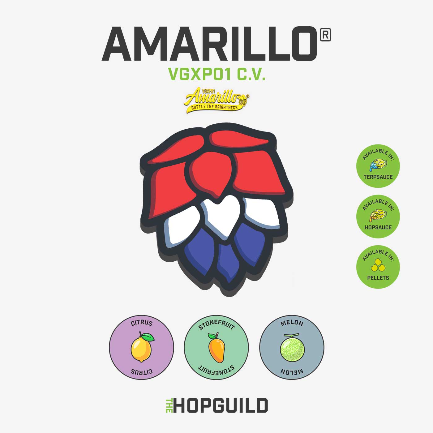 AMARILLO® VGXP01 c.v. is one of those legendary varieties and is now one of the top 10 most widely grown and used hops. It was found by Virgil Gamache Farms in the Toppenish, WA. Amarillo® offers solid bittering properties in the 9-11% Alpha Acid range and it packs one of the highest myrcene oil contents (60-70% of total oils) of any hop. This gives it a very sweet citrus flavor and aroma that is closer to oranges than grapefruit. The citrus character is backed by some light floral notes as well as melon and peaches.