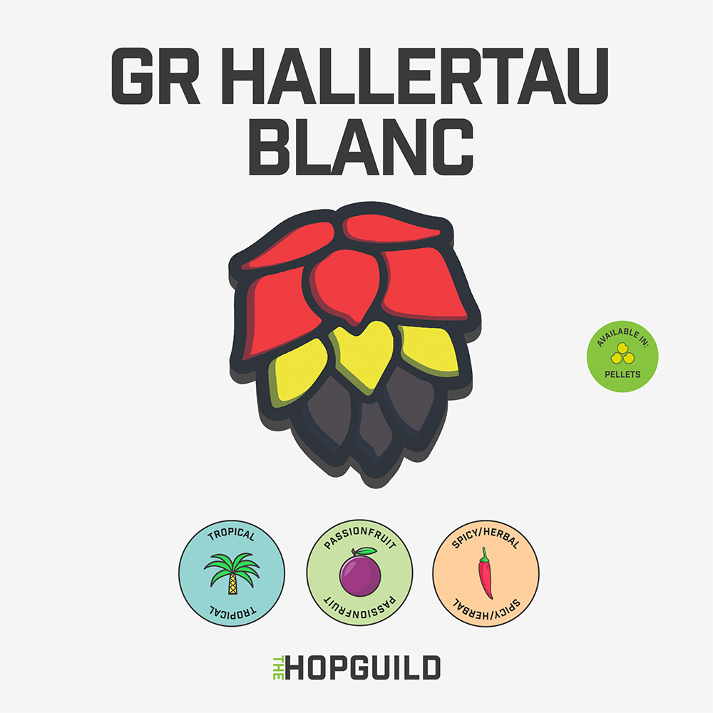 Hallertau Blanc’s flavor profile is fruity, with wine-like qualities of gooseberry and grass, similar to that of Sauvignon Blanc. It also features a complex aroma profile with notes of cassis and elderflower in addition to grapes, grapefruit and lemongrass. Pedigree Daughter of Cascade. Boasting aromas of Tropical Fruit, White Wine, and Grapefruit.